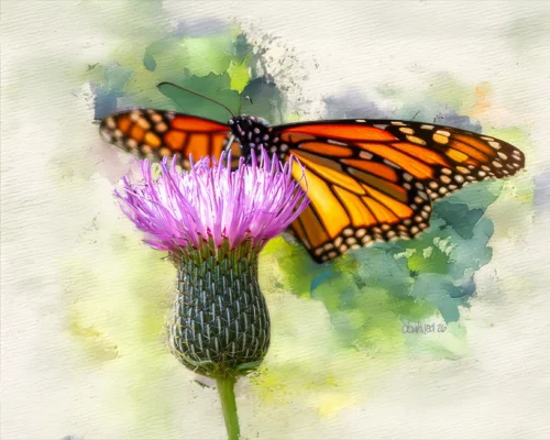 Monarch butterfly enjoying a purple thistle flower