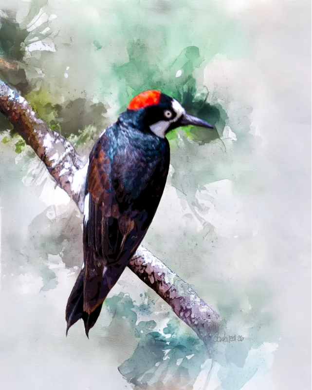 This stunning watercolor artwork depicts an Acorn Woodpecker perched gracefully on a lichen-covered branch, rendered in a beautiful blend of photorealistic detail and loose, painterly washes. The bird displays its signature markings — a vivid red crown, bold black-and-white facial pattern with a striking white eye ring, and dark iridescent plumage with warm russet-brown tones on the wings. The background dissolves into soft, misty swirls of sage green, teal, and white, giving the piece an ethereal, dreamlike quality that contrasts beautifully with the crisp detail of the bird itself. The artist’s signature is visible in the lower right corner, dated ’26, suggesting this is an original piece from 2026.