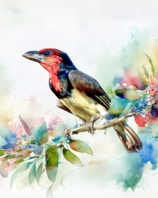This is a stunning watercolor-style artwork depicting a Black-collared Barbet, perched on a delicate branch surrounded by soft, impressionistic blooms. The bird is rendered with striking realism against a dreamy, loose background, featuring a bold crimson-red face and throat, deep navy-blue crown and collar, and warm olive-yellow underparts. The surrounding florals dissolve into soft washes of teal, coral, pink, and green, creating a beautiful contrast between the sharply detailed bird and the ethereal, painterly environment. The overall composition feels both naturalistic and artistic, blending photographic precision with the fluid spontaneity of watercolor.