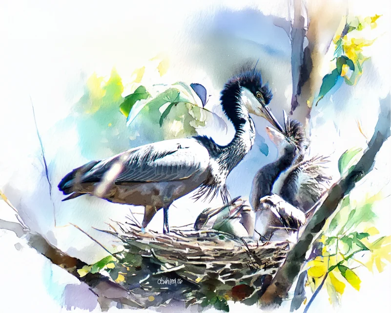 A stunning watercolor painting depicts an adult Black-headed Heron tending to its young in a treetop nest, rendered with loose, luminous brushwork characteristic of the medium. The adult bird, with its striking dark-crested head, blue-grey plumage, and sharp beak, stands protectively over a chick that stretches its neck upward in a begging posture, while a smaller, fluffier nestling rests nearby in the woven twig nest. The surrounding foliage is suggested with vibrant splashes of yellow-green and teal, and the background dissolves into soft washes of white and pale blue, giving the composition an airy, ethereal quality. The artist’s confident, fluid strokes capture both the delicate vulnerability of the chicks and the commanding presence of the parent, creating a warmly intimate scene of wildlife and parenthood.
