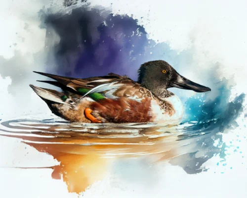A striking watercolor-style artwork of a male Canvasback Duck gliding gracefully across calm water. The bird displays its classic coloring — a rich, russet-red head, a sleek dark bill, black chest, and pale silvery-white body — all rendered in soft, painterly brushstrokes that blend into a misty, ethereal background of greens, grays, and warm earth tones. The water around the duck shimmers with gentle ripples and reflections, and the composition fades beautifully at the edges into an unpainted white, giving the piece an elegant, unfinished quality typical of traditional watercolor technique.