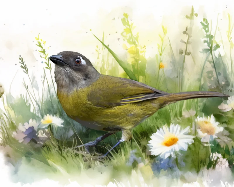 This beautiful watercolor style illustration depicts a Common Bush Tanager with olive-green and warm brown plumage, standing among a lush garden scene of white daisies, yellow wildflowers, and tall green grasses. The bird has a rounded body, a gray-brown head with a subtle white eye ring and a dark beak, and its underparts fade from olive-yellow to a lighter belly. It stands on slender bluish-gray legs, appearing alert and curious as it forages among the blooms. The soft, luminous watercolor technique gives the entire composition a dreamy, ethereal quality, with delicate splashes of color blending seamlessly into the white background.