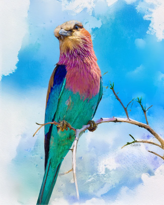 This stunning artwork depicts a Lilac-breasted Roller (Coracias caudatus) perched on a bare, gnarled branch, rendered in a painterly watercolor style that blends photographic realism with artistic flourish. The bird is shown in a proud, upright pose, gazing upward and to the left with an alert, almost regal bearing. Its plumage is a breathtaking mosaic of colors — a creamy buff head transitioning into vivid lilac-pink and magenta on the breast, with wings and tail feathers that sweep through brilliant turquoise, cobalt blue, and deep navy.