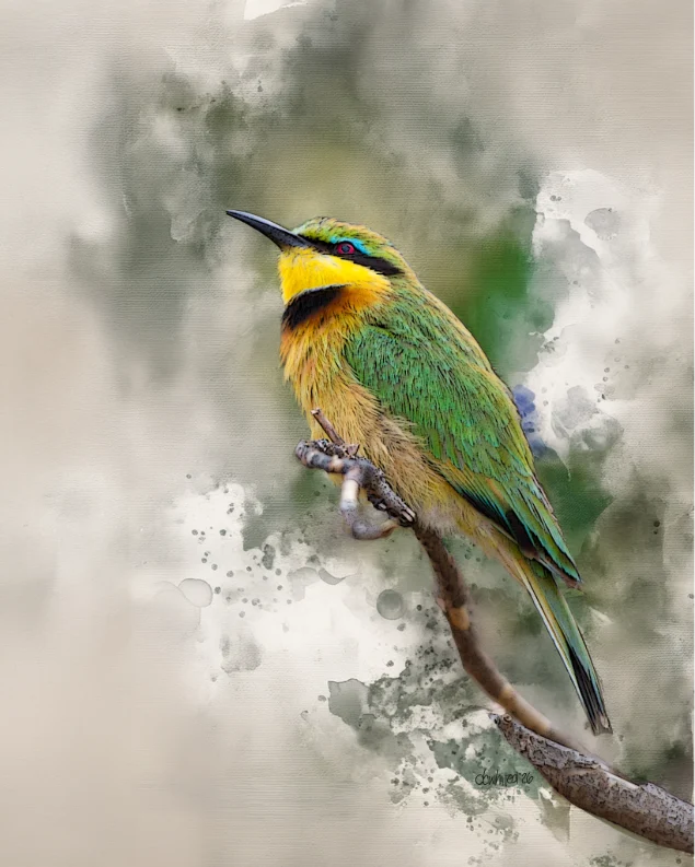 A stunning watercolor-style artistic rendering of a Little Bee-eater perched on a bare branch in South Africa. The bird displays a dazzling array of colors — a vivid yellow throat, iridescent green back and wings, golden-brown underparts, and a striking black eye stripe accented by a vivid red eye and blue facial patch. Its long, slightly curved black bill points upward alertly. The background transitions between soft, muted grey-green watercolor washes and paint splatter effects, giving the piece an ethereal, painterly quality that makes the bird’s vibrant plumage pop dramatically against the diffused backdrop.