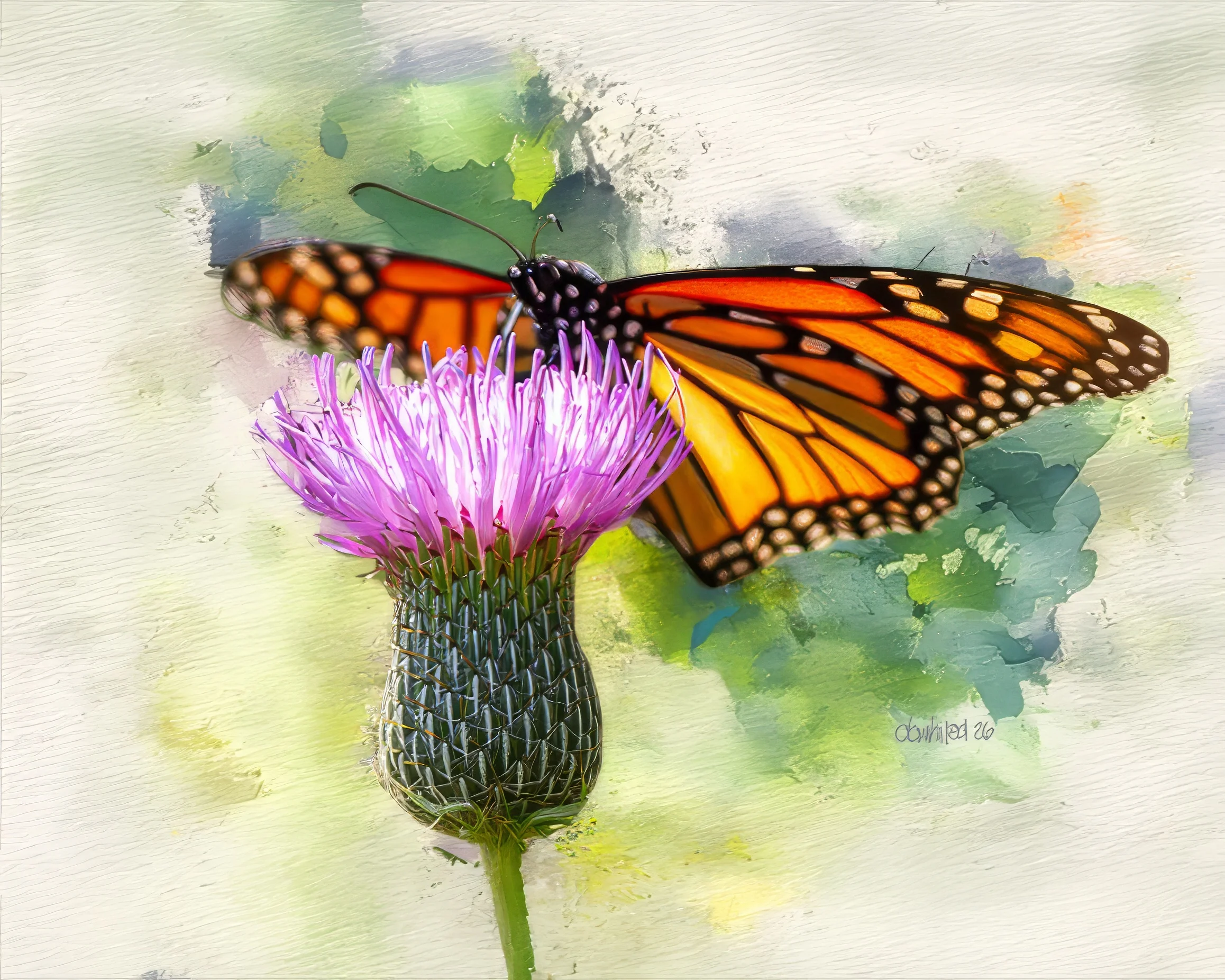 A stunning watercolor-style artwork depicts a monarch butterfly perched atop a blooming purple thistle flower, its vibrant orange and black wings spread wide in elegant display. The butterfly’s intricate wing patterns — bold orange panels edged with dark borders and dotted with white spots — are rendered with remarkable detail, creating a striking contrast against the soft, impressionistic background of blended greens, blues, and creamy whites. The thistle itself is beautifully detailed, with spiky pink-purple florets emerging from a textured, armor-like green bud, while the overall composition blends the crisp realism of the central subjects with the loose, dreamy washes of a watercolor painting, giving the piece a ethereal, painterly quality.