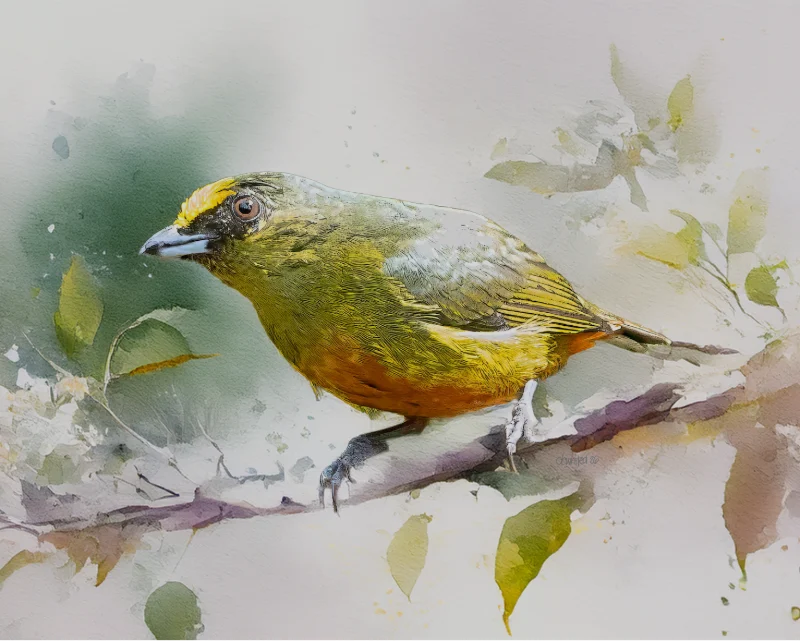 A beautiful watercolor painting of an Olive-backed Euphonia perched on a branch, rendered in soft, flowing washes of color. The bird displays a striking combination of olive-green on its back and wings, a warm golden-yellow on its face and underparts, and a rusty orange on its belly. A small patch of brighter yellow crowns its head just above its short, pale bill. The background melts into loose, impressionistic splashes of sage green, lavender, and muted earth tones, with loosely painted leaves framing the composition. The overall effect is delicate and luminous, blending realistic detail in the bird’s feathers with the spontaneous, fluid quality characteristic of fine watercolor art.