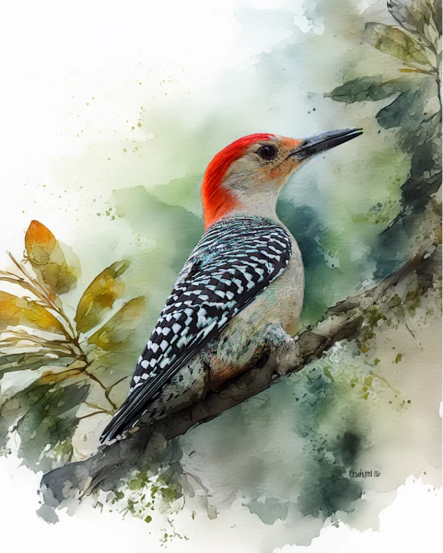 A striking watercolor painting of a Red-bellied Woodpecker perched on a branch, rendered with delicate brushwork and soft, muted green and earthy tones in the background. The bird is depicted in profile, showcasing its distinctive black-and-white barred back, pale underside, and vivid red cap that extends from the bill to the nape. The loose, impressionistic foliage surrounding the bird contrasts beautifully with the precise detailing of the woodpecker’s feathers, giving the piece an elegant balance between realism and painterly abstraction.