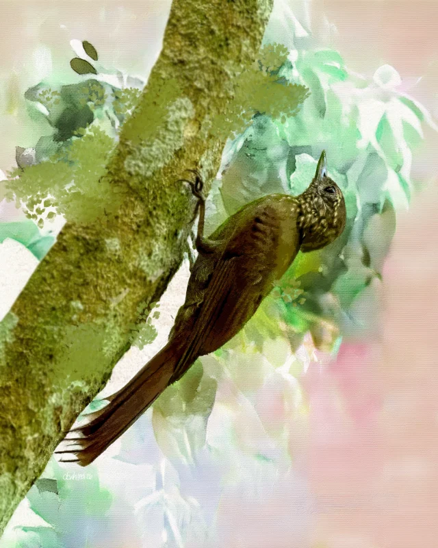 This is a beautifully rendered digital painting depicting a spotted woodcreeper — a slender, brown bird with streaked and spotted plumage — clinging vertically to the bark of a moss-covered tree trunk, as these birds characteristically do when foraging for insects. The bird’s long, slightly curved bill points upward, and its stiff tail feathers press against the bark for support, a classic woodcreeper posture. The artistic style blends photorealistic detail on the bird itself with soft, impressionistic watercolor washes of green, pink, and white in the background foliage, giving the piece a dreamy, ethereal quality that contrasts beautifully with the earthy, textured bark at the center of the composition.