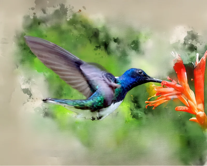 A stunning watercolor-style digital artwork depicts a White-necked Jacobin Hummingbird mid-flight as it reaches toward vibrant orange tubular flowers, likely a tropical honeysuckle or similar nectar-rich bloom. The bird showcases a striking iridescent plumage — a deep cobalt blue head and throat, shimmering green along the breast, and soft gray-brown wings spread wide in graceful motion. Its long, slender beak is perfectly poised to sip from the vivid orange blossoms, whose yellow stamens burst outward in rich detail. The background dissolves into loose, painterly splashes of green and taupe, giving the piece a dreamy, impressionistic quality that beautifully contrasts with the crisp realism of the bird and flowers at the center.